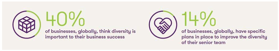 In our recent International Business Report (IBR) research into diversity, we captured the views of 2,500 business leaders in 35 countries. On average, only 40% of businesses believe diversity is important to their success, and just 14% are taking action to improve the diversity of their senior team. We find that businesses are, for the most part, not ethnically or gender diverse. Age diverse teams are more common, although it is far from the norm to have a senior team member who is under 35 years old.